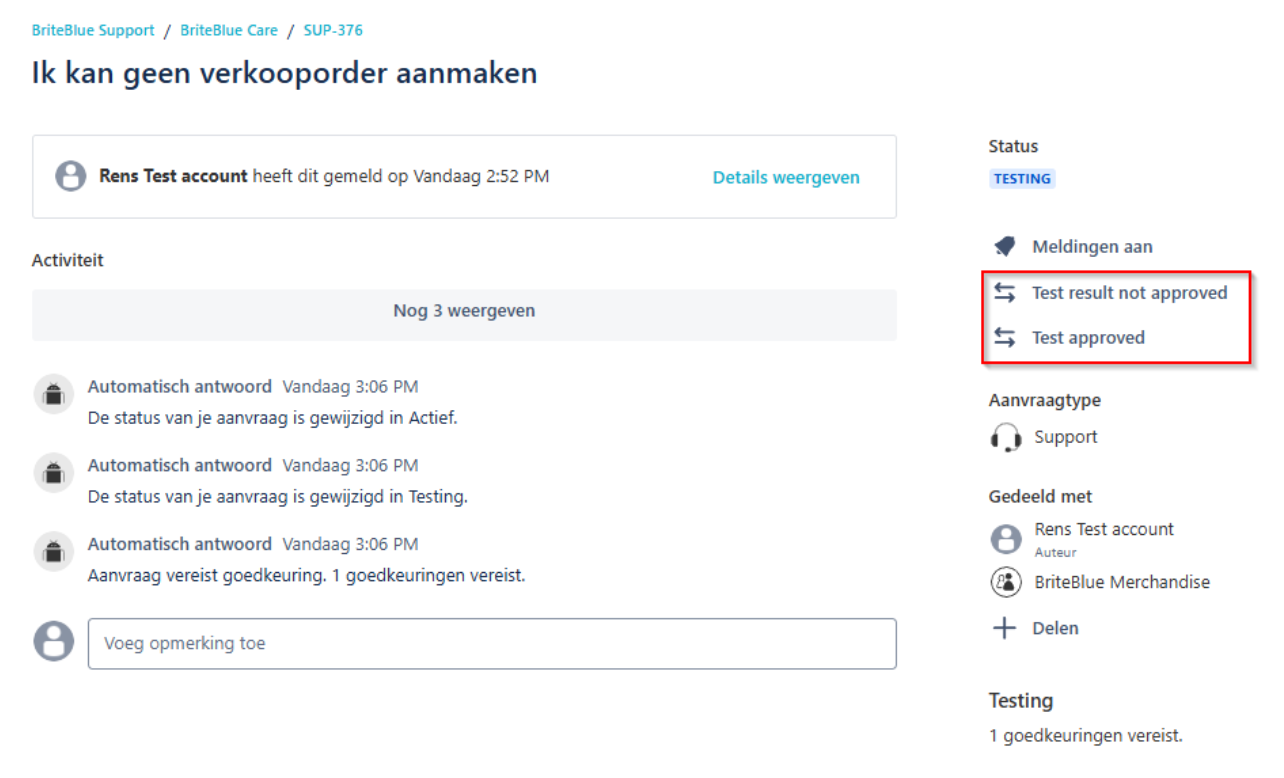 8. Wanneer een ticket de status “testing” heeft is het noodzakelijk om de het testresultaat aan te geven via de knoppen aan de zijkant