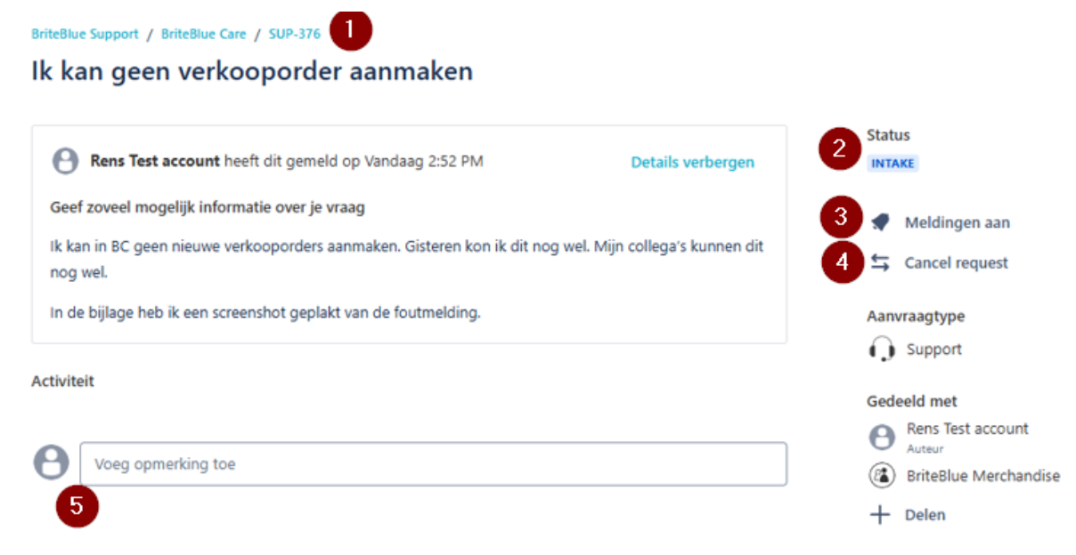 4. Als het ticket niet meer relevant is kan het met de optie “Cancel request” worden ingetrokken. Let op: dit kan alleen wanneer wij het ticket nog niet in behandeling hebben genomen.