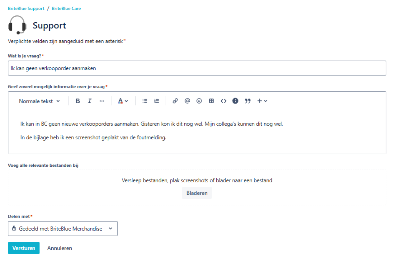 3. Maak een ticket aan voor Support, zorg voor een complete omschrijving waarbij de volgende punten worden meegenomen: